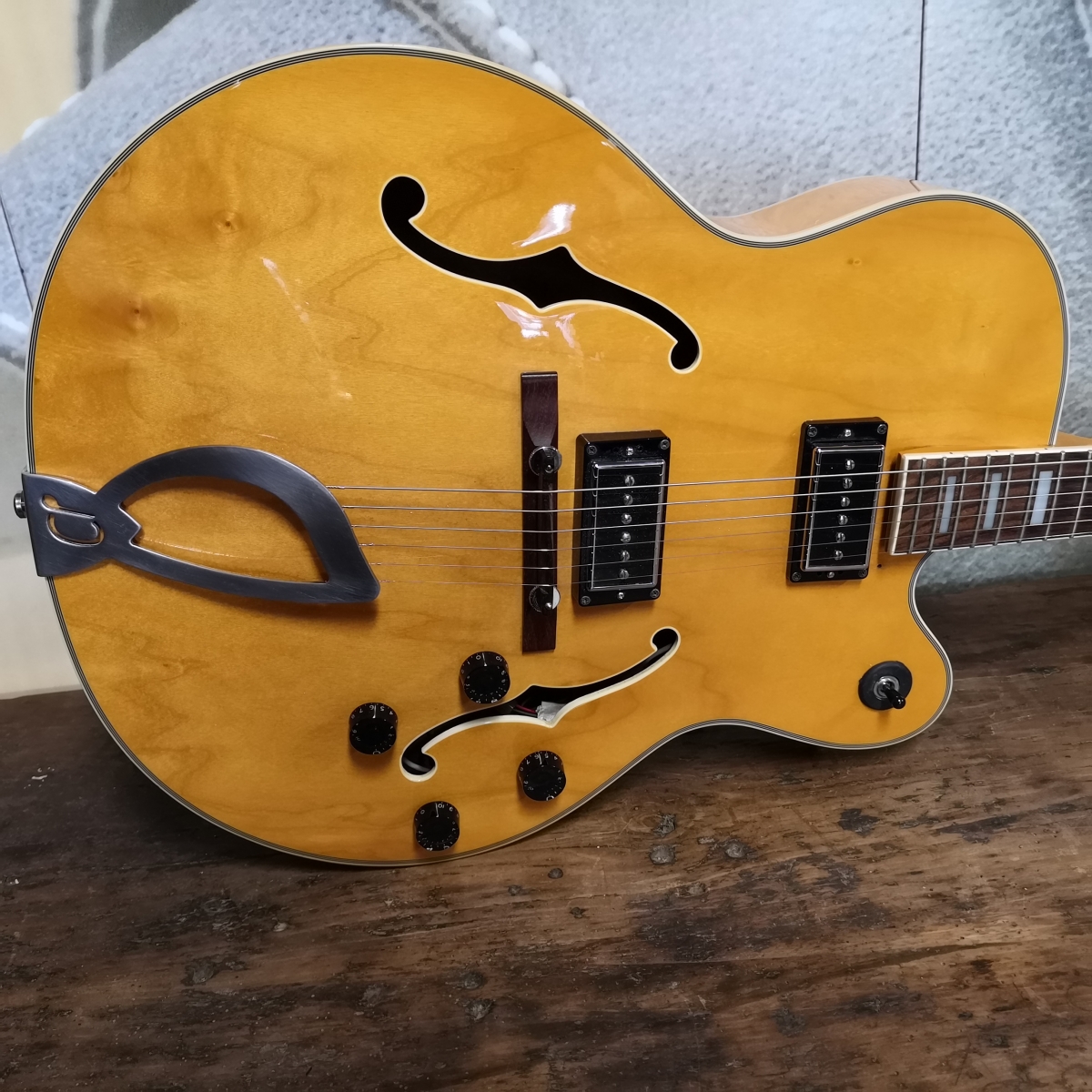 Une fidèle réplique de la Guild X500 de 1963, modèle haut de gamme de la marque rachetée par Fender en 1995. Une première main en état cosmétique produite en 1999. Lutherie coréenne irréprochable (ateliers Cort). Caisse et manche érable. Beau vernis. Touche en palissandre, ornée de filets blancs à liserés noirs. Frettes de type medium jumbo. Sillet réglable. Trussrod. Mécaniques Kluson à bain d'huile. Elégant cordier en forme de lyre. équipé de 2 Micros Gibson P94.