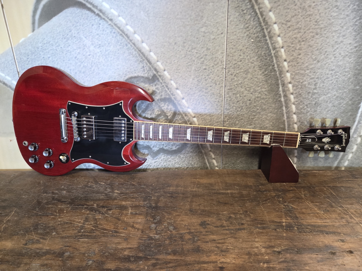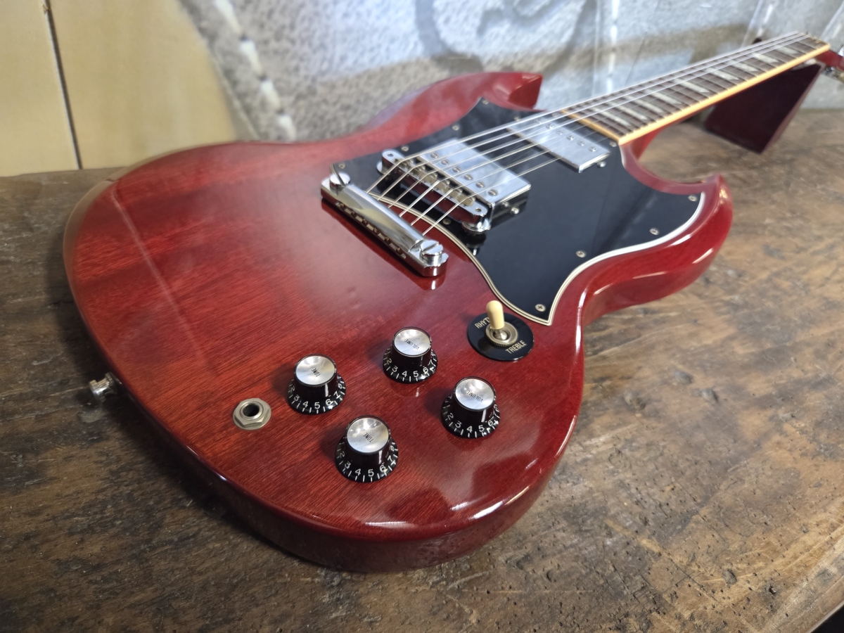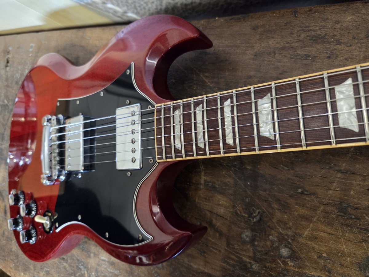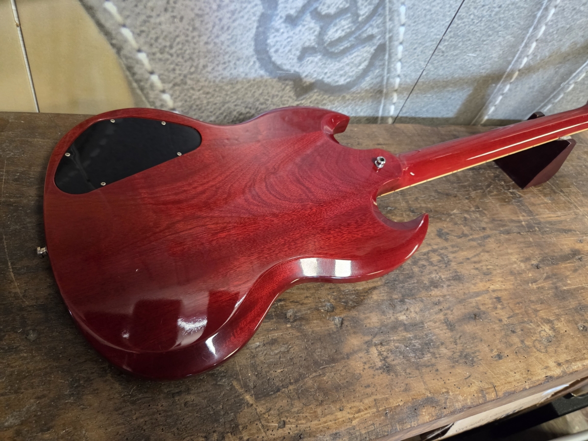 On est sur une conception classique, corps et manche acajou avec touche palissandre. On est sur une SG bien hargneuse en saturation et claquante en son clair. Les potars sont très progressifs et les tonalités offrent un feutre intéressant. Fourni avec son case original.