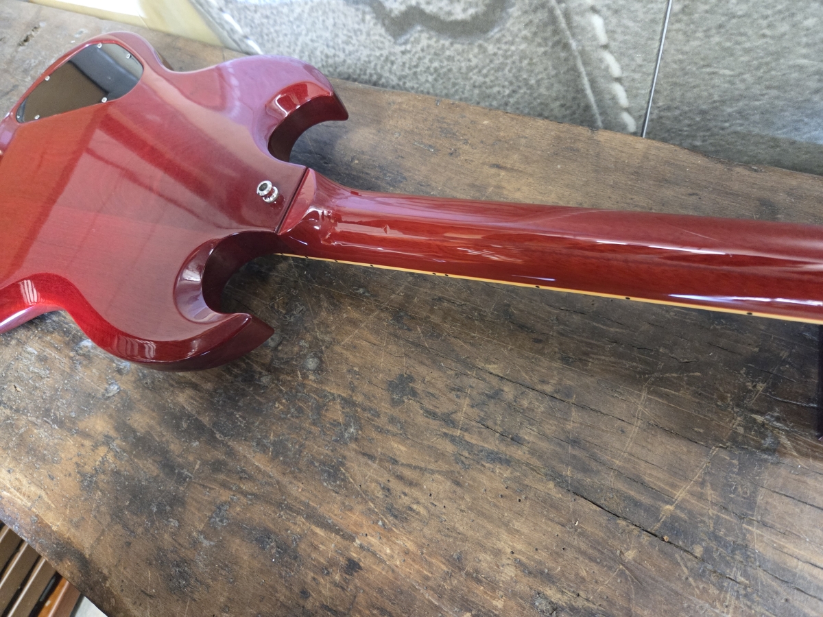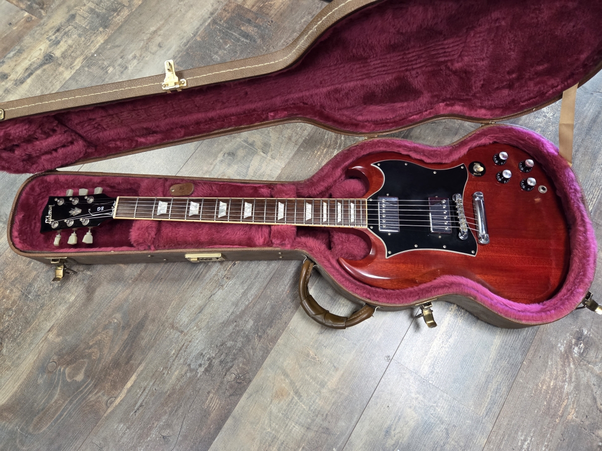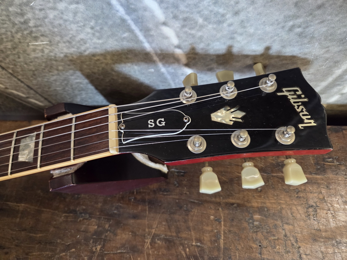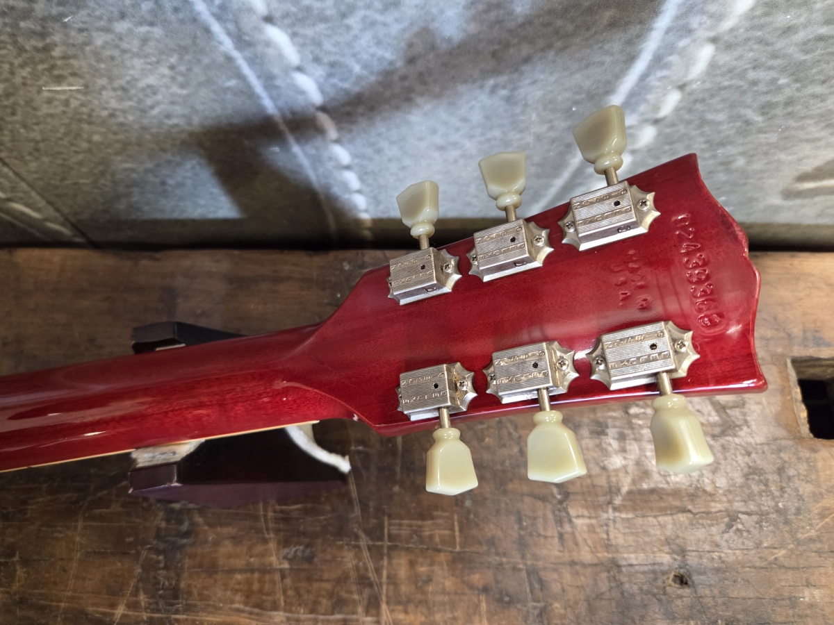 On est sur une conception classique, corps et manche acajou avec touche palissandre. On est sur une SG bien hargneuse en saturation et claquante en son clair. Les potars sont très progressifs et les tonalités offrent un feutre intéressant. Fourni avec son case original.