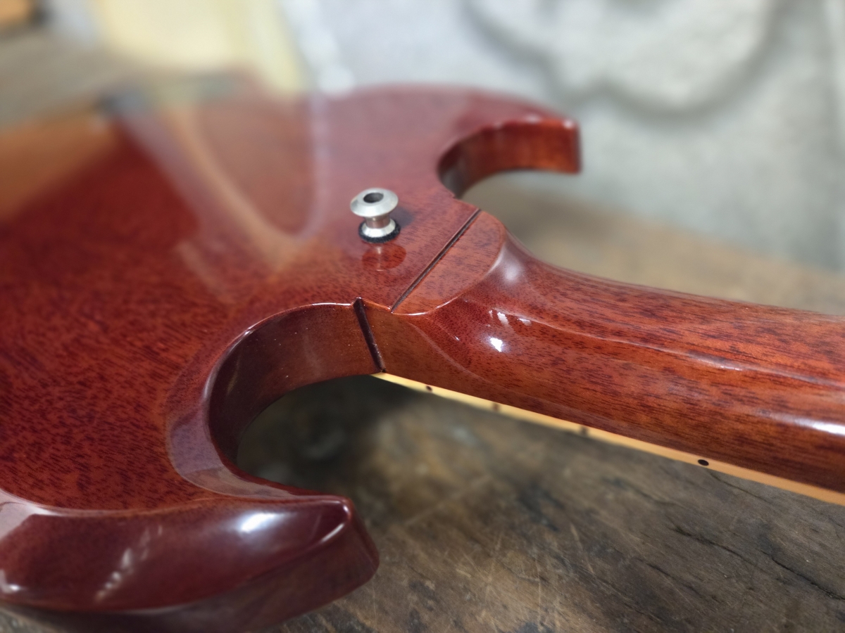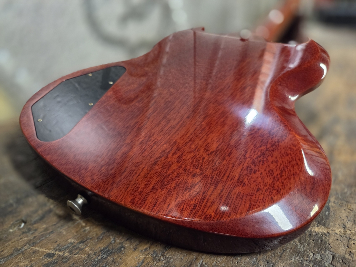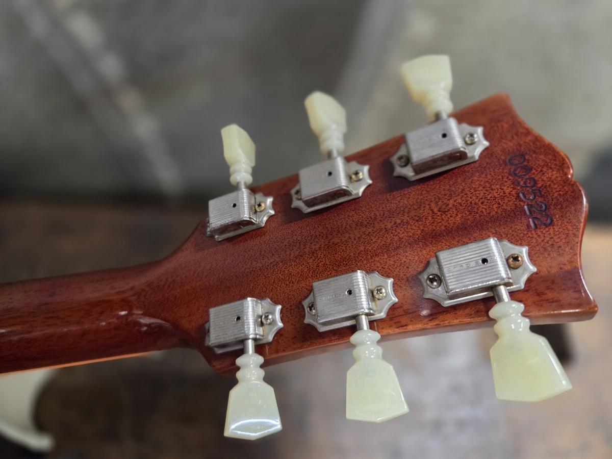 Construction millimétrée (jointure "Long Neck Tenon", colle "hot hide glue"), dimensions scannées au laser, composants de grade supérieur (corps et manche en Acajou massif, touche Palissandre massif, micros Custombucker Alnico III), plastiques recréés chimiquement.