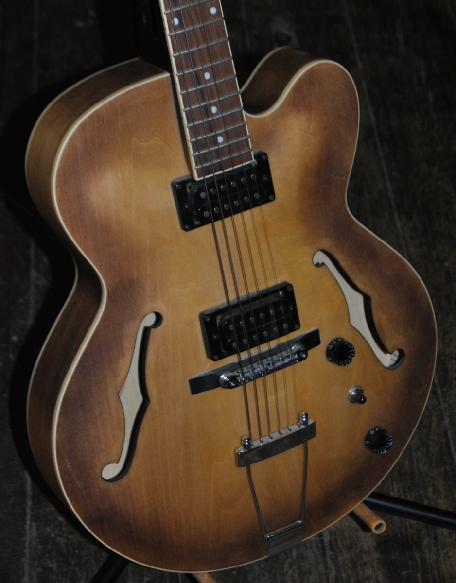 Introduite au catalogue dans la gamme Artcore en 2014, la guitare électrique Ibanez AF55 TF est une hollow body entrée de gamme dont voici les principales caractéristiques : caisse Erable, manche collé en Acajou avec touche Palissandre (20 frettes, diapason 24.75" type Gibson© ES-175©), 2x micros humbuckers Ibanez, chevalet + cordier Ibanez.
