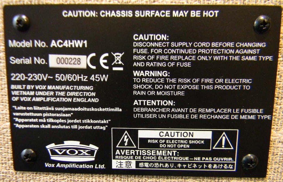 Voici le mini combo tout lampe Vox. Ce modèle est câblé main. Il envoie 4 watts en classe A avec une EL84 et deux 12AX7 sur un 12" Celestion G12M Greenback. Un gain, un volume, un treble et un contrôle de basse auxquels s'ajoutent le célèbre Top Boost issue de l'AC30 et un switch voice Hot/Cool.