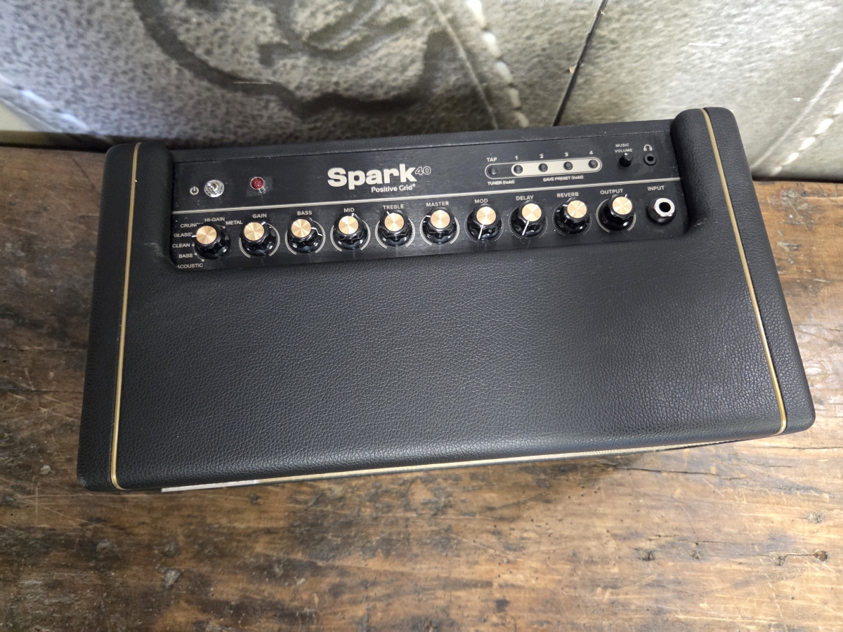 Contrôles: Amp Type, Gain, Bass, Mid, Treble, Master, Mod, Delay, Reverb, Output Volume, Music Volume