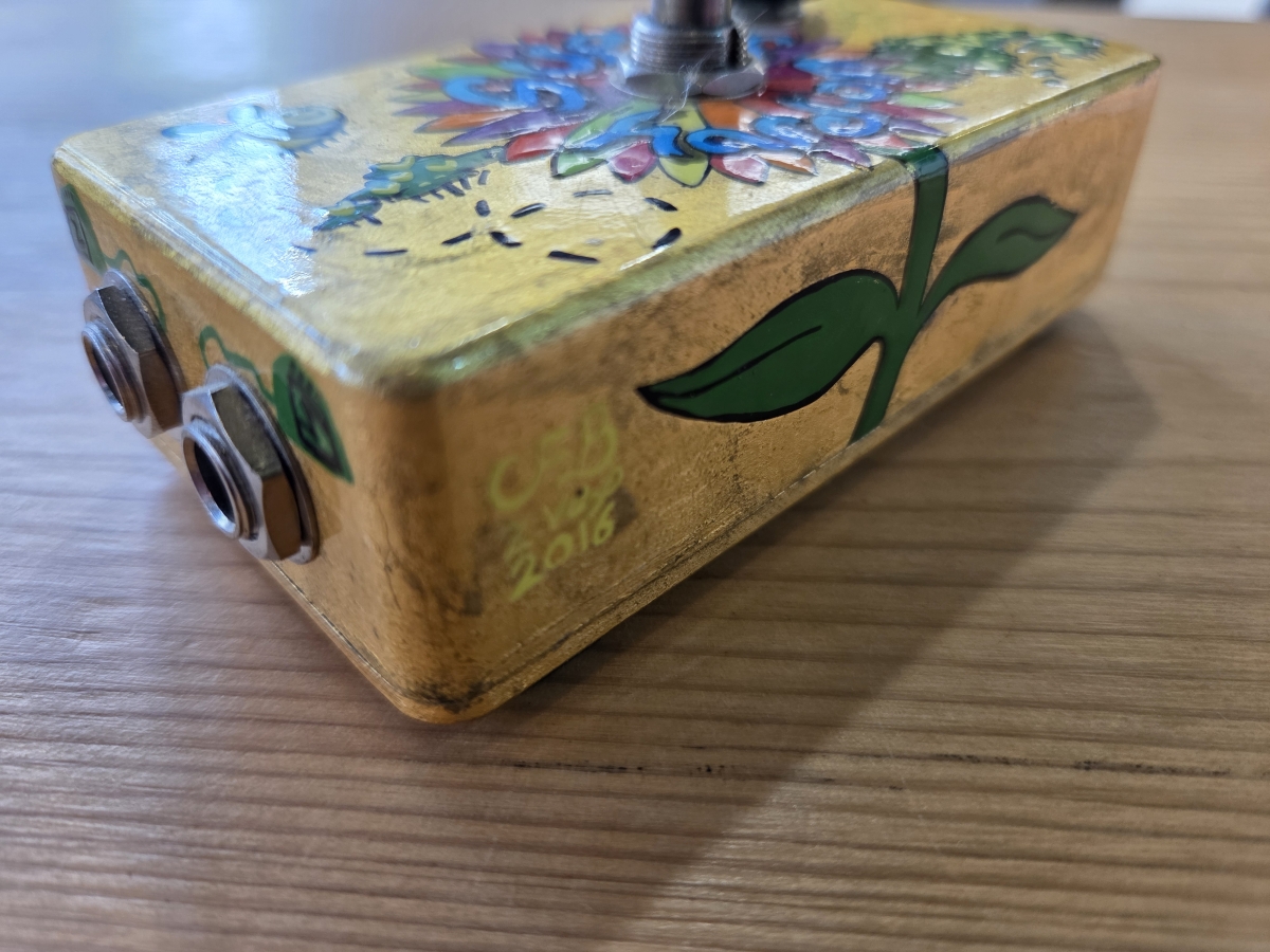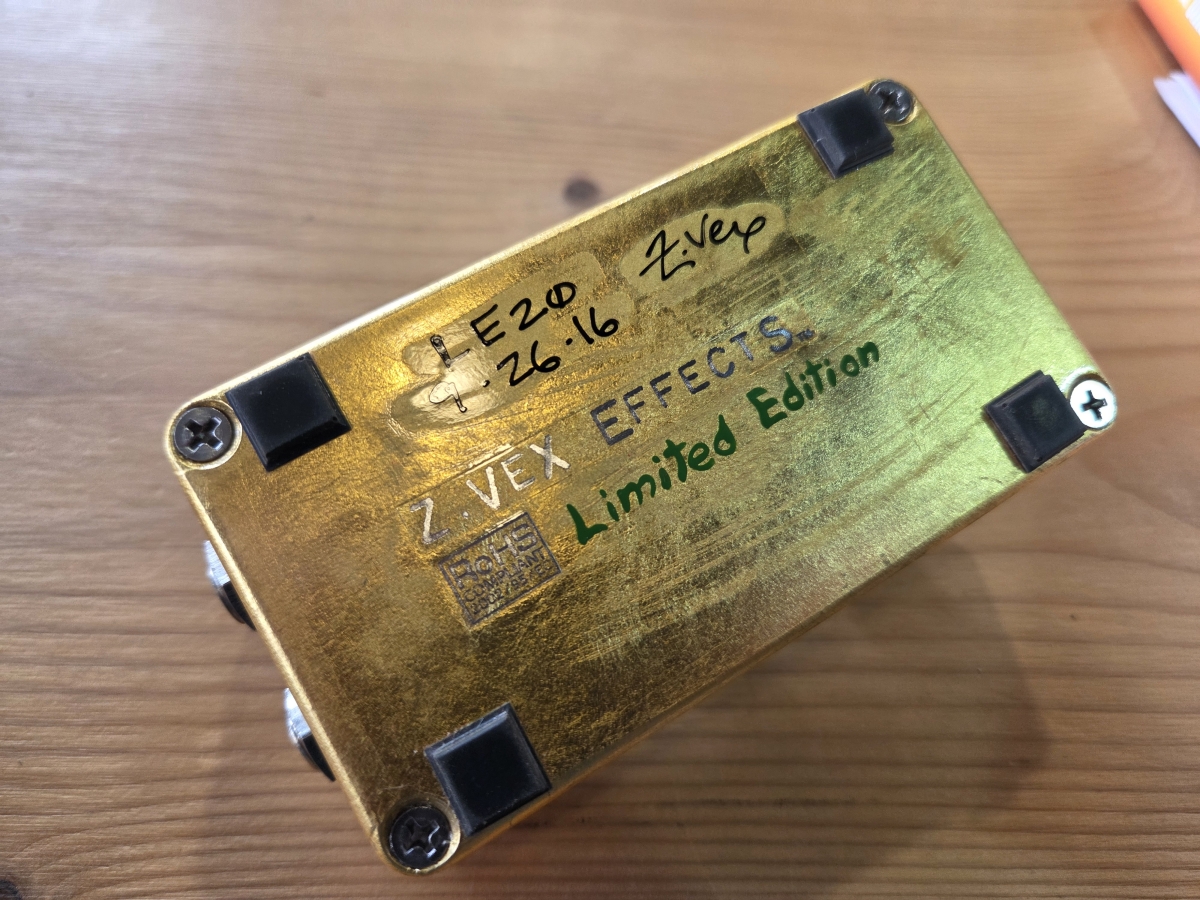 la Super Hard ! On revisite avec élégance le design original de la SHO, grâce à une peinture de Colin Bridges sur fond de feuille d'or 23 carats. Chaque pédale est ornée d'une plaque commémorative du 20e anniversaire de la Super Hard On, portant le numéro de l'édition. Un certificat d'authenticité, imprimé à la main sur papier artisanal à l'aide d'une presse Gocco et signé par Zack Vex et Colin Bridges, accompagne chaque pédale.